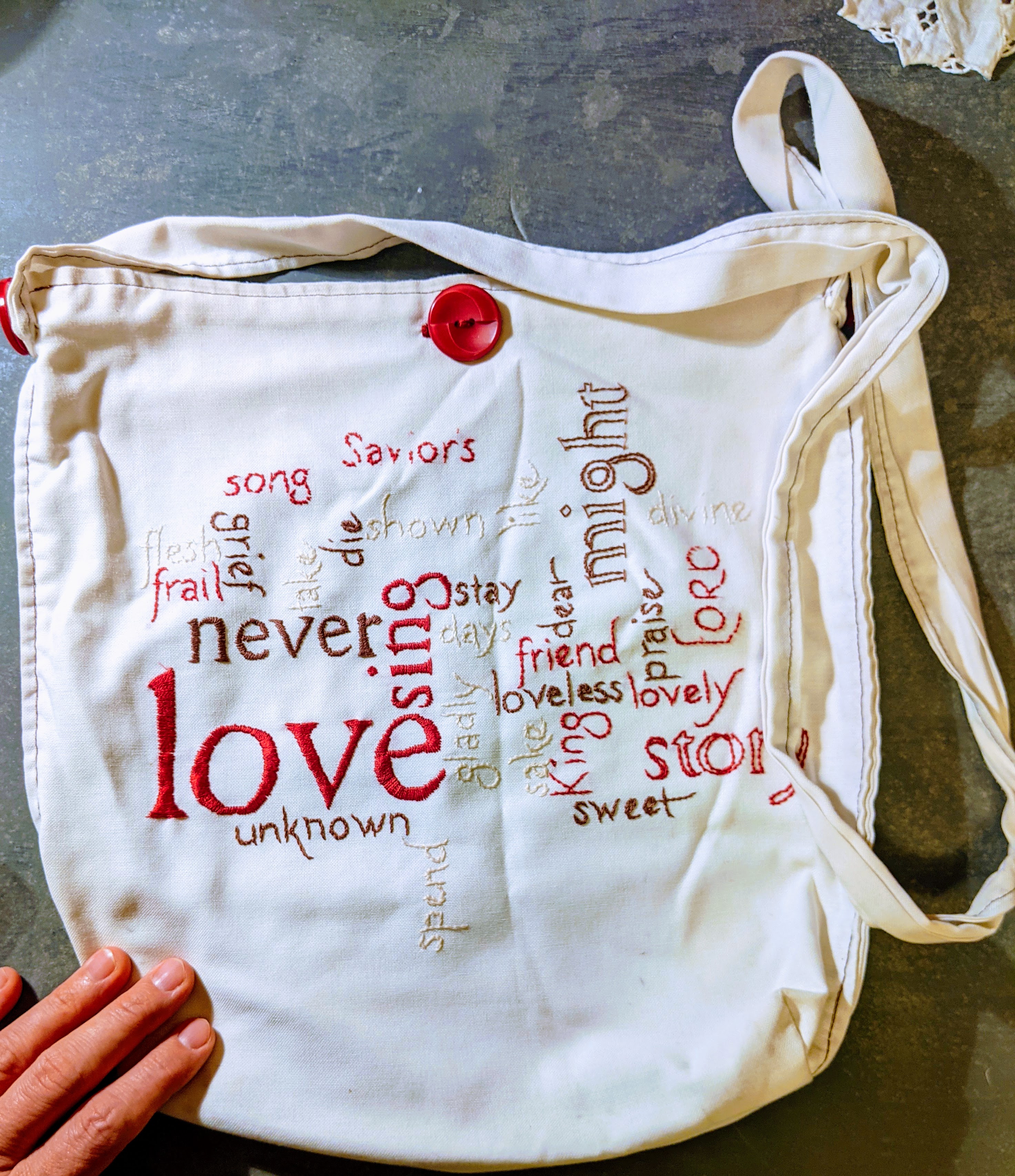 I’ve loved words for as long as I can remember. Our family parsed words to death, arguing whether a word meant one thing or another. When I taught ESL in Poland, I made the bag pictured above with words from a favorite hymn because I thought an English teacher should have a bag with words. And Wordles were so much fun! They’ve kinda gone out of style by now, but I loved their eloquence and simplicity.